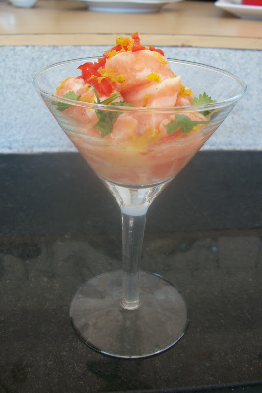 Misturar os sucos de limão e tangerina ao salmão e levar à geladeira coberto por meia hora. Retirar e acrescentar a pimenta cortada bem fininha, as raspas de tangerina, o azeite, as folhas de coentro, temperar com sal e pimenta e servir.